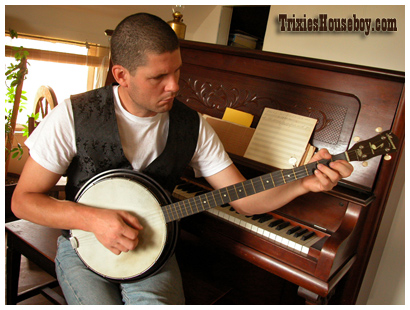 This is the second set in the series from Trixie's mother's house. It features me with two instruments that I have no idea how to play; the banjo and the piano. Thankfully I have always been adept on the skin flute!!! |