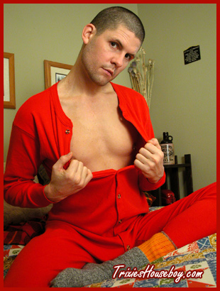 There's also something perversely daddy-esque about the loggerlike look of the union suit, like a dirty old man who takes you on a hunting trip or a horny woodsman locked up with no women and nothing but a smoke-filled den of fellow timber workers. The dirty old man appeal brings me back to the allure of the fly; when a man exposes his cock through his fly and leaves everything else on, it always looks to me like he is insatiably horny AND needs to prepare himself for a quick getaway. Poking his prick through his fly while staying otherwise dressed SMACKS of a clandestine encounter. Oh so naughty!! -Trixie |